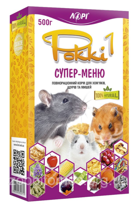 Повнораціонний корм для дрібних гризунів для хом'ячків, для миш, для щурів Роккі 1 СУПЕР МЕНЮ Лорі.